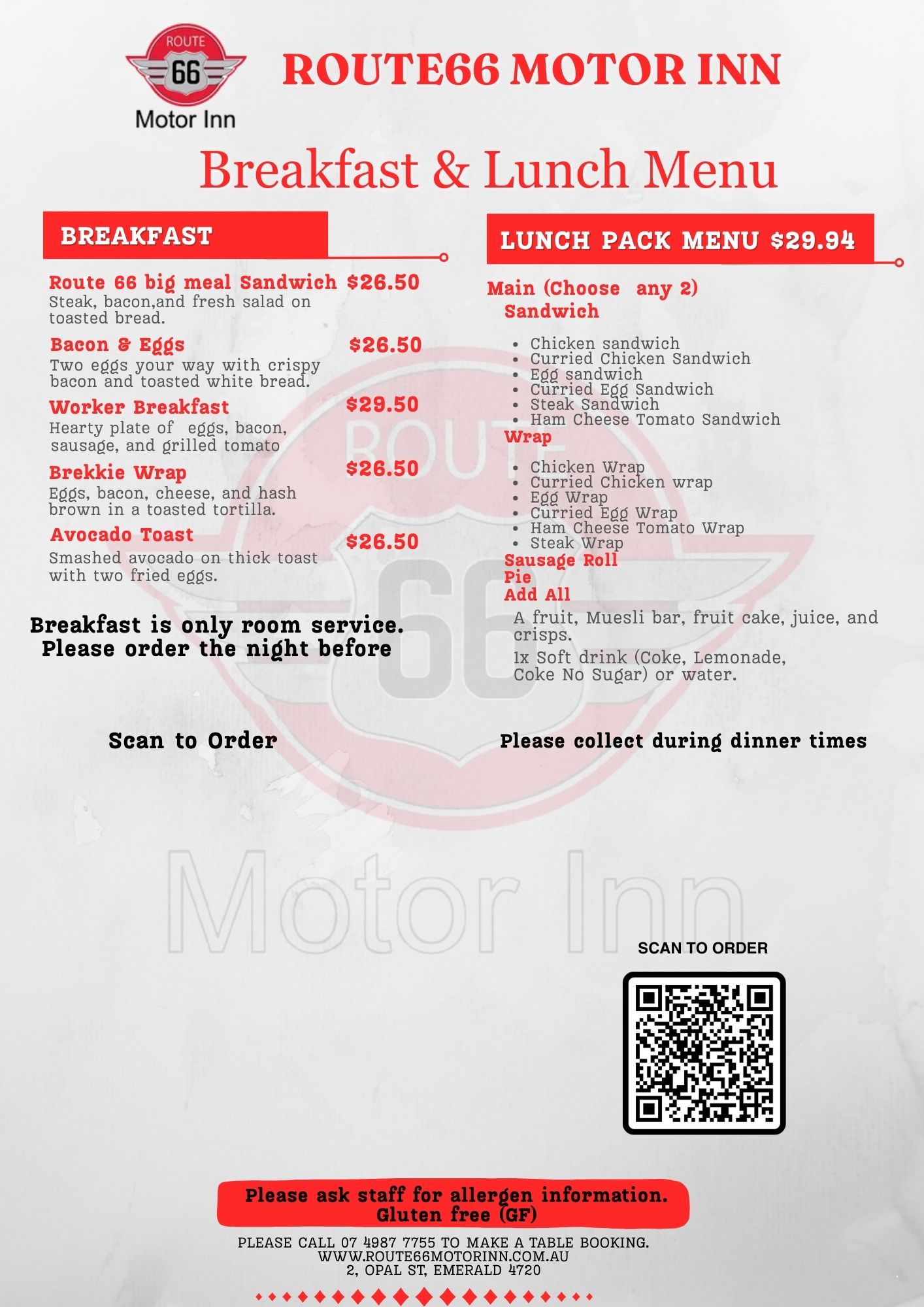 The Route 66 bar features indoor and outdoor seating and patrons have access to the full Restaurant 66 menu during restaurant opening hours. The bar is open for drinks Monday-Thursday from 5:30 pm-8:00pm. On weekends and public holidays we deliver to your room unless there is a special request. The hours are subjected to change without prior notice. Please contact the reception for updated information.